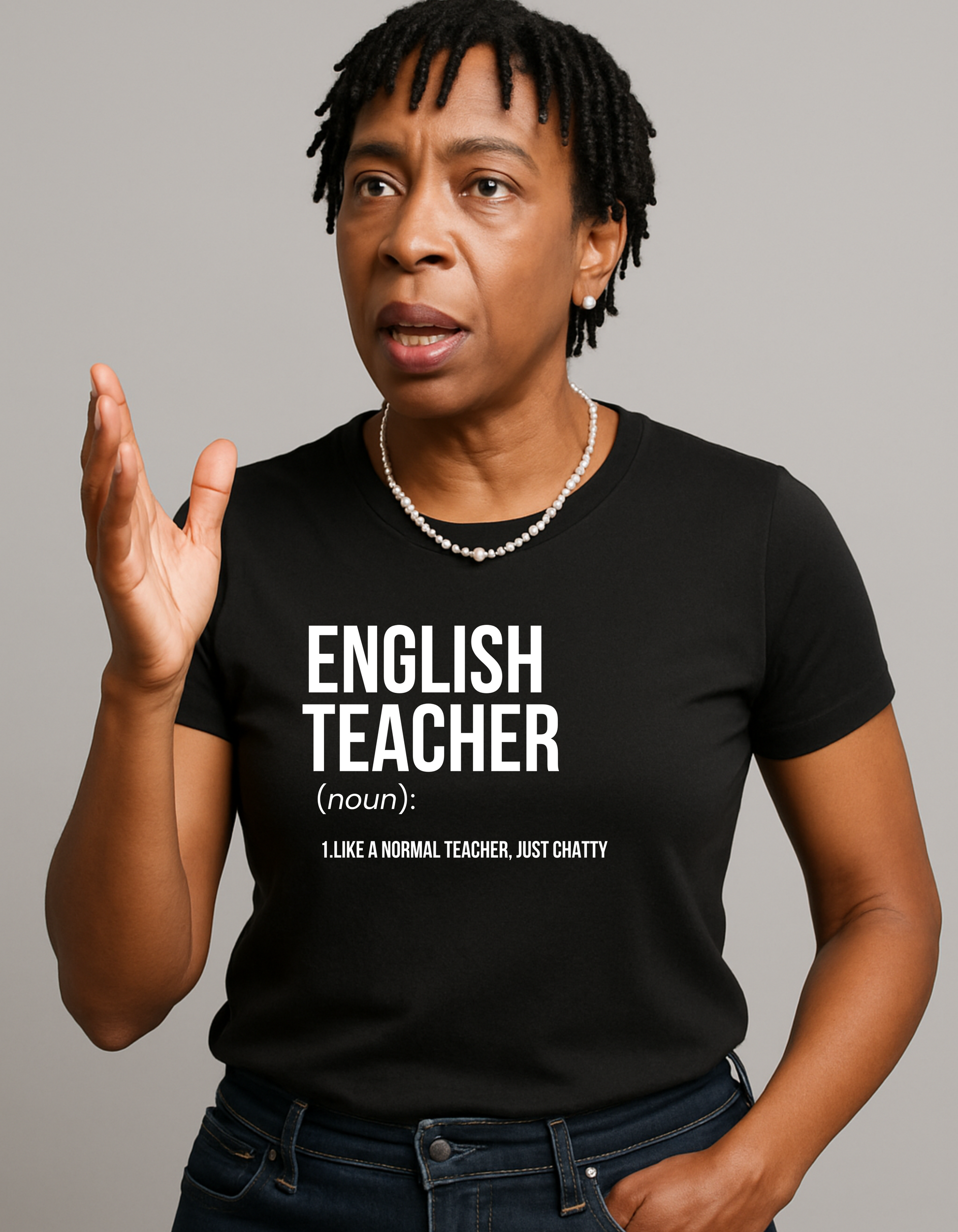 Crafted with soft, breathable fabric, this premium tee offers comfort and style for all English teachers—whether you're dissecting classic literature, teaching grammar with a twist, guiding creative writing sessions, or encouraging students to find their voice. Embrace your chatty charm and share your passion for the English language with this fun and stylish tee!