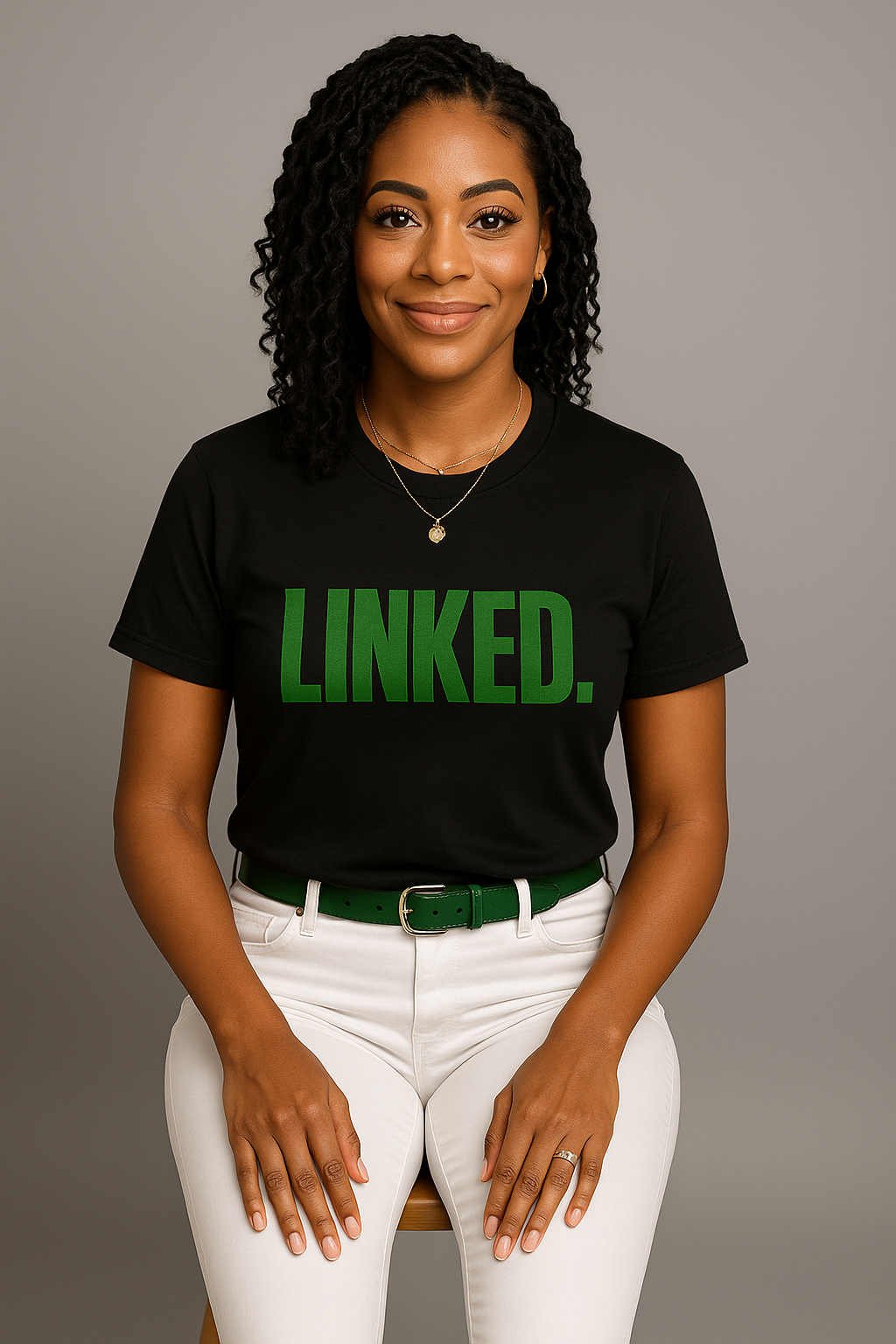 Celebrate your elegance and unity with the LINKED. t-shirt, the ultimate tee for the distinguished Ladies of The Links, Incorporated. This beautifully crafted tee in iconic emerald green and white captures the essence of friendship, service, and timeless style.