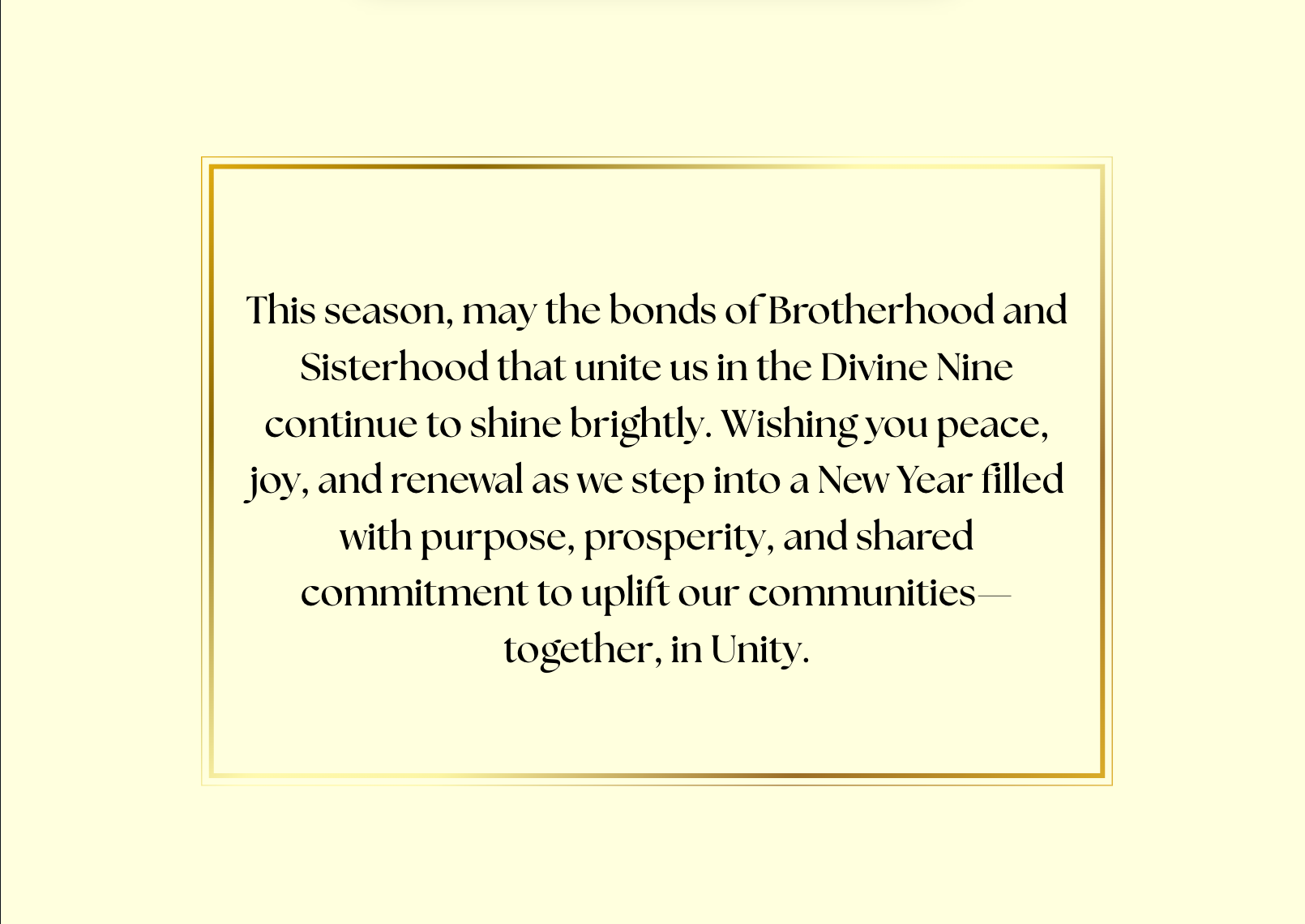 Celebrate the season with elegance and unity. Designed to honor the rich legacy of the Divine Nine organizations within the NPHC, these premium holiday cards are perfect for chapter leaders, mentors, and trailblazers who embody service and sisterhood/brotherhood.
