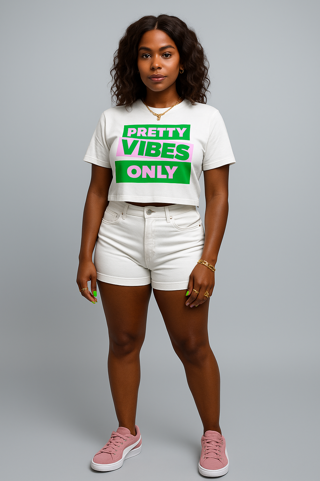 The Pretty Vibes Only crop tee is a summer essential for the ladies of who wear Pink & Green. They bring grace, beauty, and energy to every space they enter. Light, flirty, and full of PRETTY pride, this tee is made for Greek fests, sunny strolls, and fun moments that turn heads.