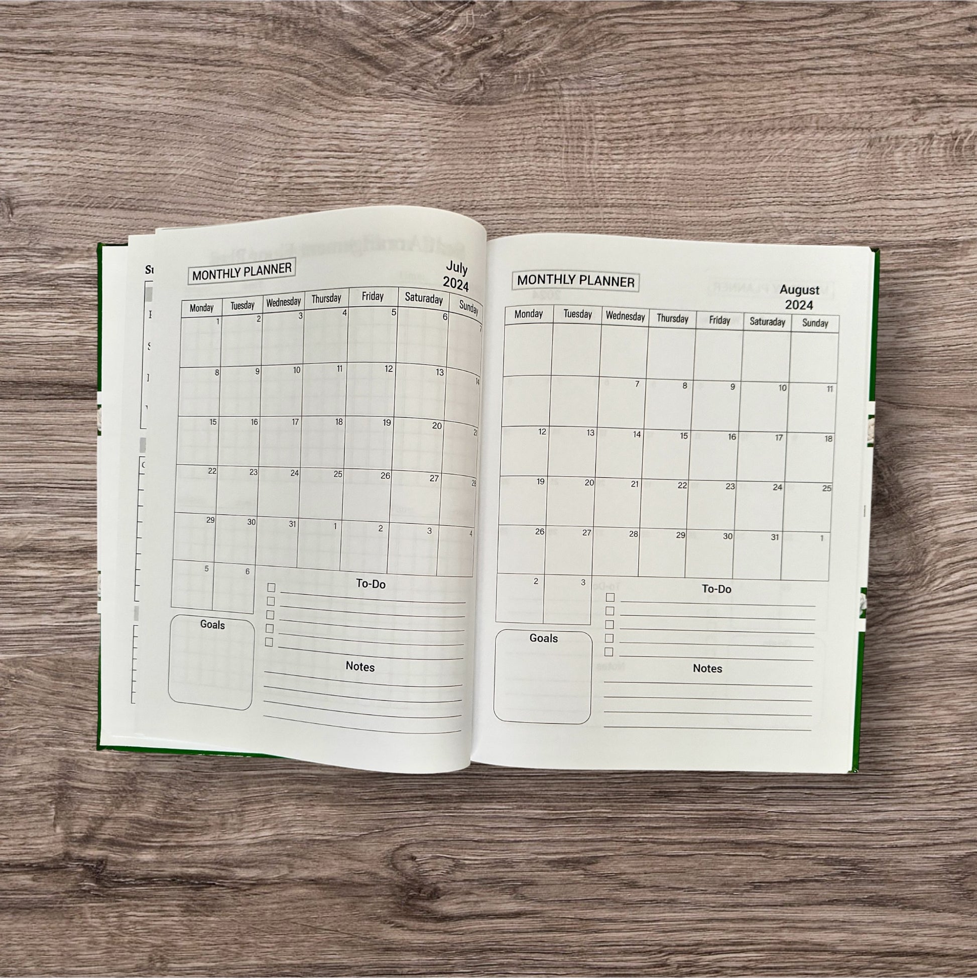 **Monthly Spreads:**Start each month with a clear overview and dedicated notes section, perfect for jotting down important reminders and reflections.
